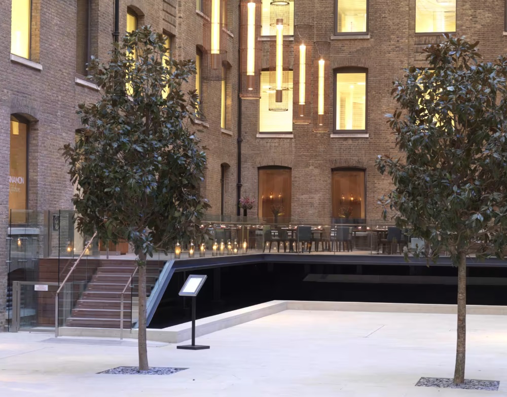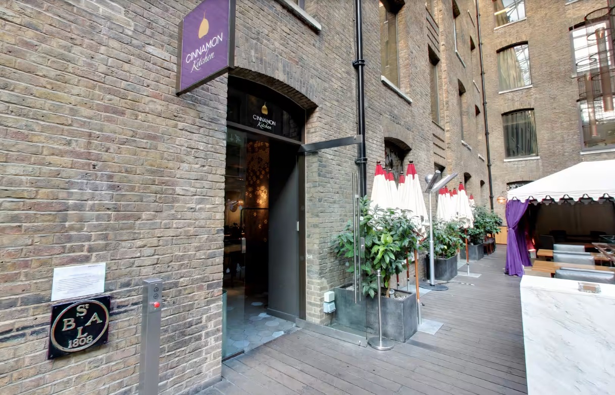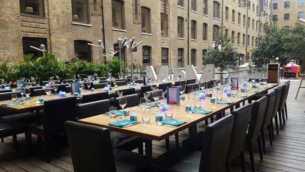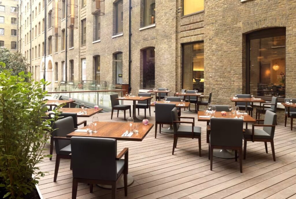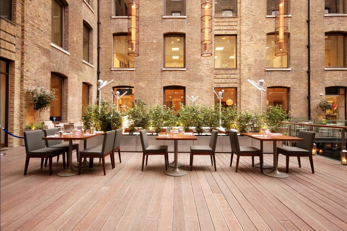 The marvelous upper terrace at the establishment provides diners with an al fresco experience, affording captivating views of Devonshire Square.