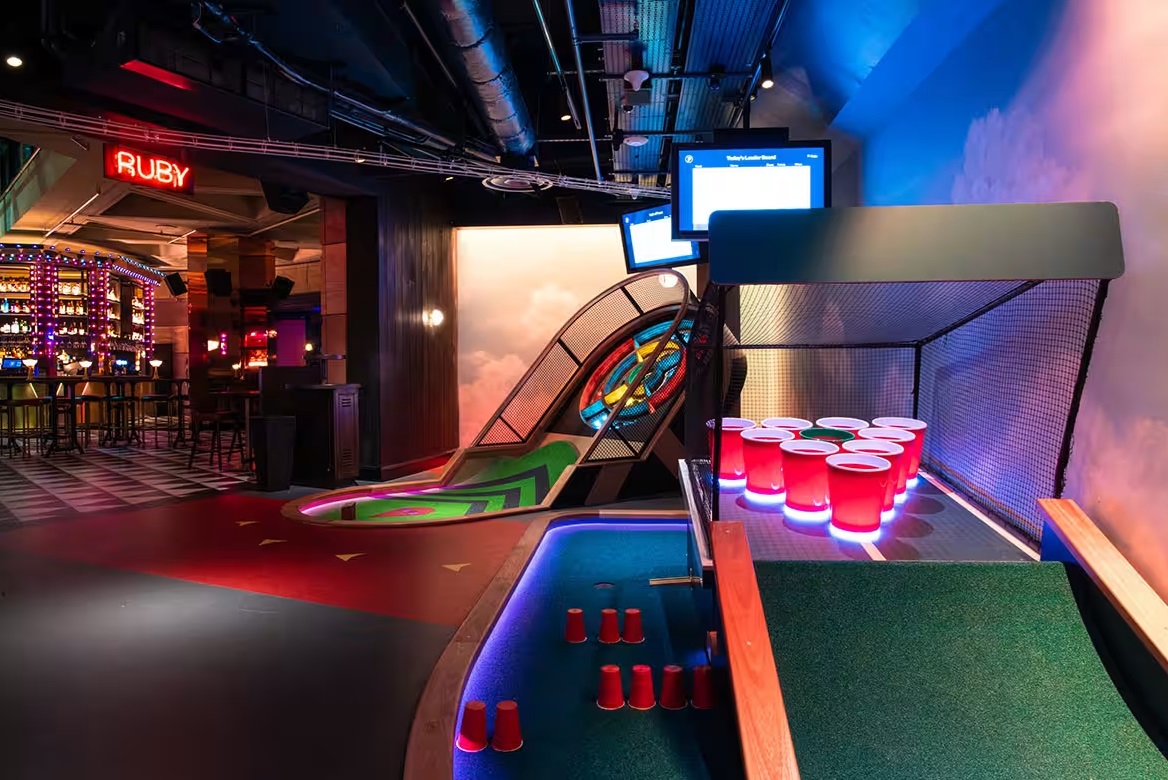Puttshack delivers an upscale and technologically advanced minigolf experience that inclusively engages all participants. This reimagined minigolf concept relies on groundbreaking technology to enhance the game, eliminating the need for traditional scoring tools and ensuring a cheat-proof environment. Complementing the immersive experience is a globally inspired food & drinks menu and a full bar service, all set within a remarkably cool environment that encourages guests to linger.