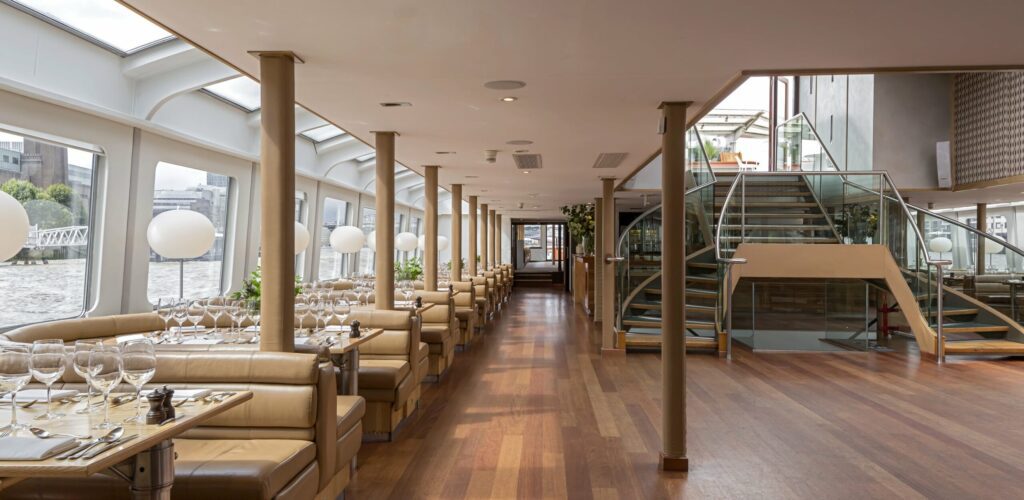 The flagship yacht, the Silver Sturgeon, available for exclusive hire, holds the distinction of being the largest passenger vessel cruising central London, navigating between Westminster and Greenwich. With a spacious open top deck, guests enjoy an unparalleled vantage point to behold iconic landmarks such as the London Eye, St. Paul’s Cathedral, and Tower Bridge. This majestic venue can accommodate up to 550 guests, making it ideal for summer boat parties in London, as well as office summer party events.