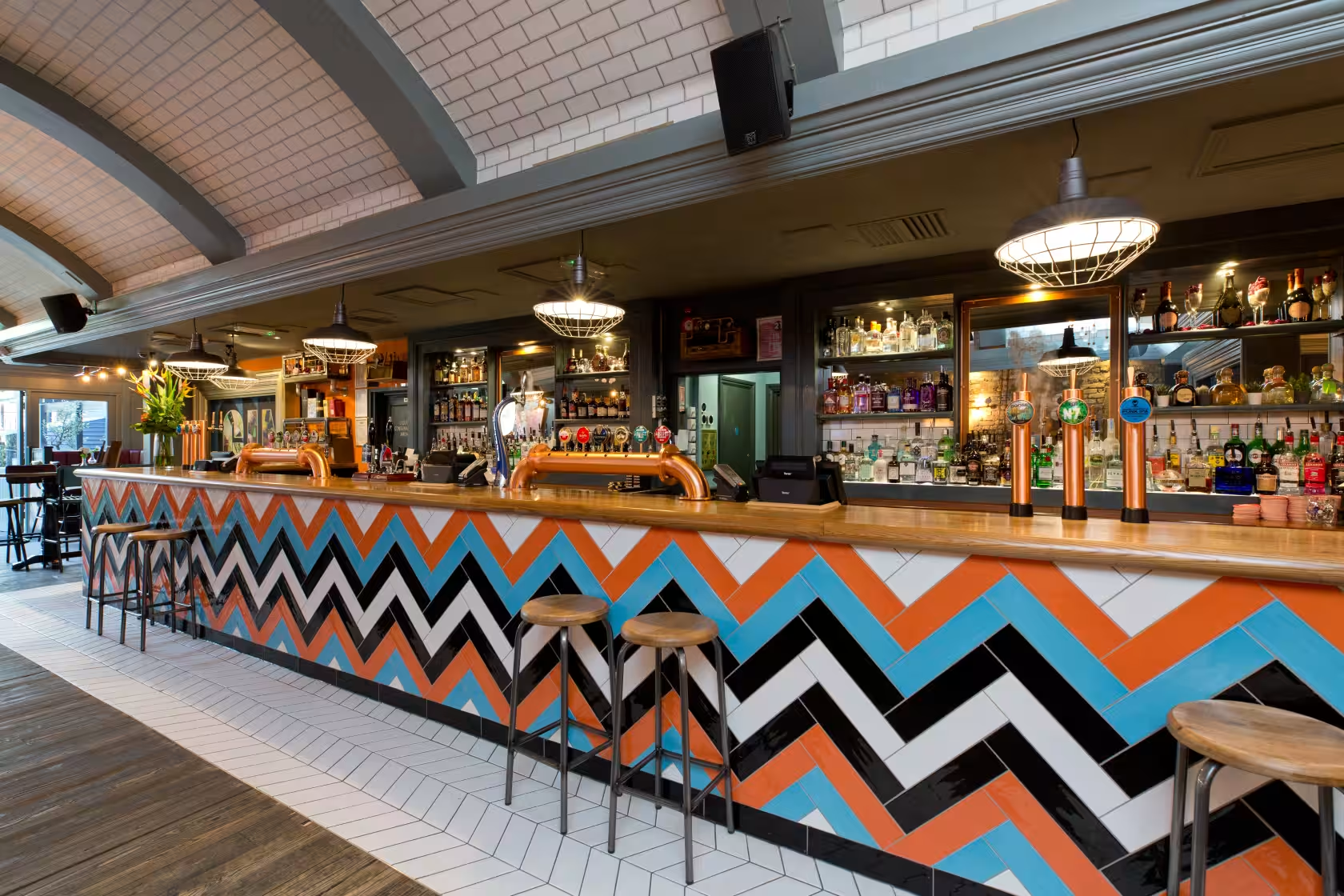 Indulge in the vibrant atmosphere of the generously sized bar, tucked beneath an inviting exposed brick archway and adorned with charming retro-style furnishings.