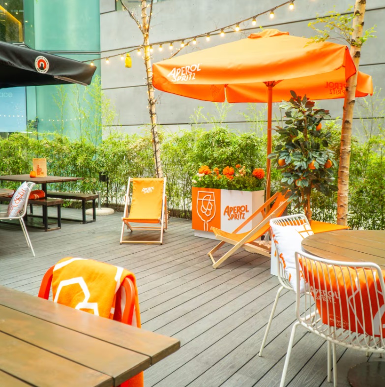The venue offers a rear outdoor terrace, a versatile space that allows for flexible furniture arrangements. Music and fairy lights are provided to create a vibrant atmosphere.