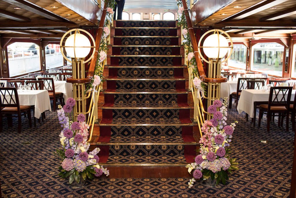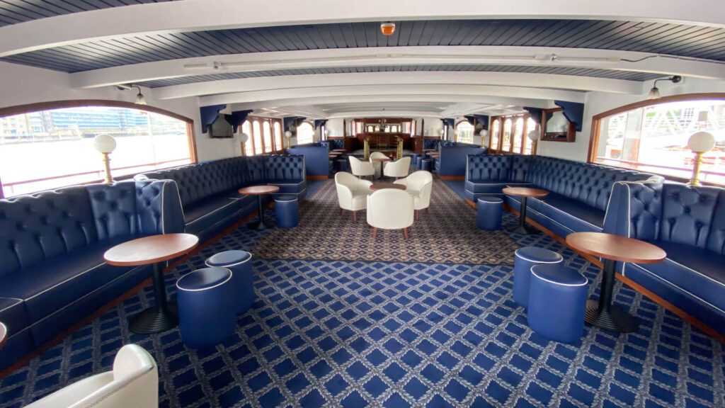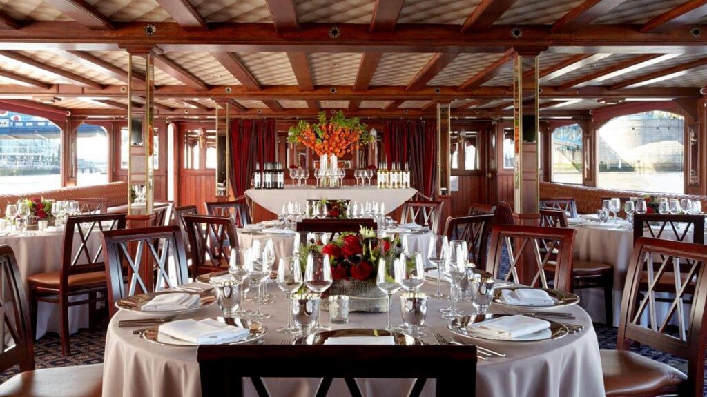 After an extensive refurbishment in 2020, the Elizabethan presents a spacious upper deck that serves as a flexible setting for guests to mingle, conduct presentations, dine, or dance beneath the stars, thanks to its expansive retractable roof. The air-conditioned saloon, adorned with wooden paneling and sumptuous carpets, offers breathtaking views through generously sized windows. These windows were carefully installed during a half-million pound refit to preserve the vessel’s graceful lines, ensuring a luxurious and memorable experience for all on board.