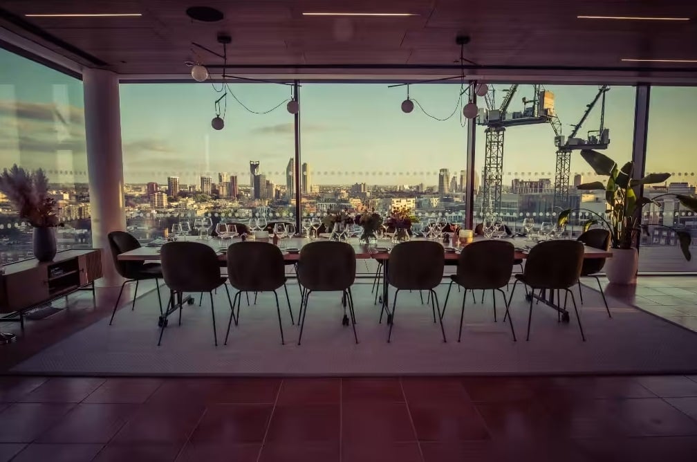 The private dining room provides pristine dual-aspect vistas of London, showcasing sights such as the Shard. Featuring direct entry to a private terrace, it presents an optimal setting for hosting intimate dinners or cocktail gatherings, crafted to leave a lasting impression and spark inspiration. This space is well-suited for private dinners, client gatherings, standing receptions accommodating up to 50 individuals, or corporate dinners for up to 30 attendees.