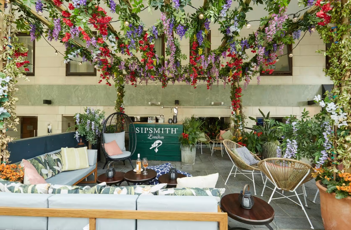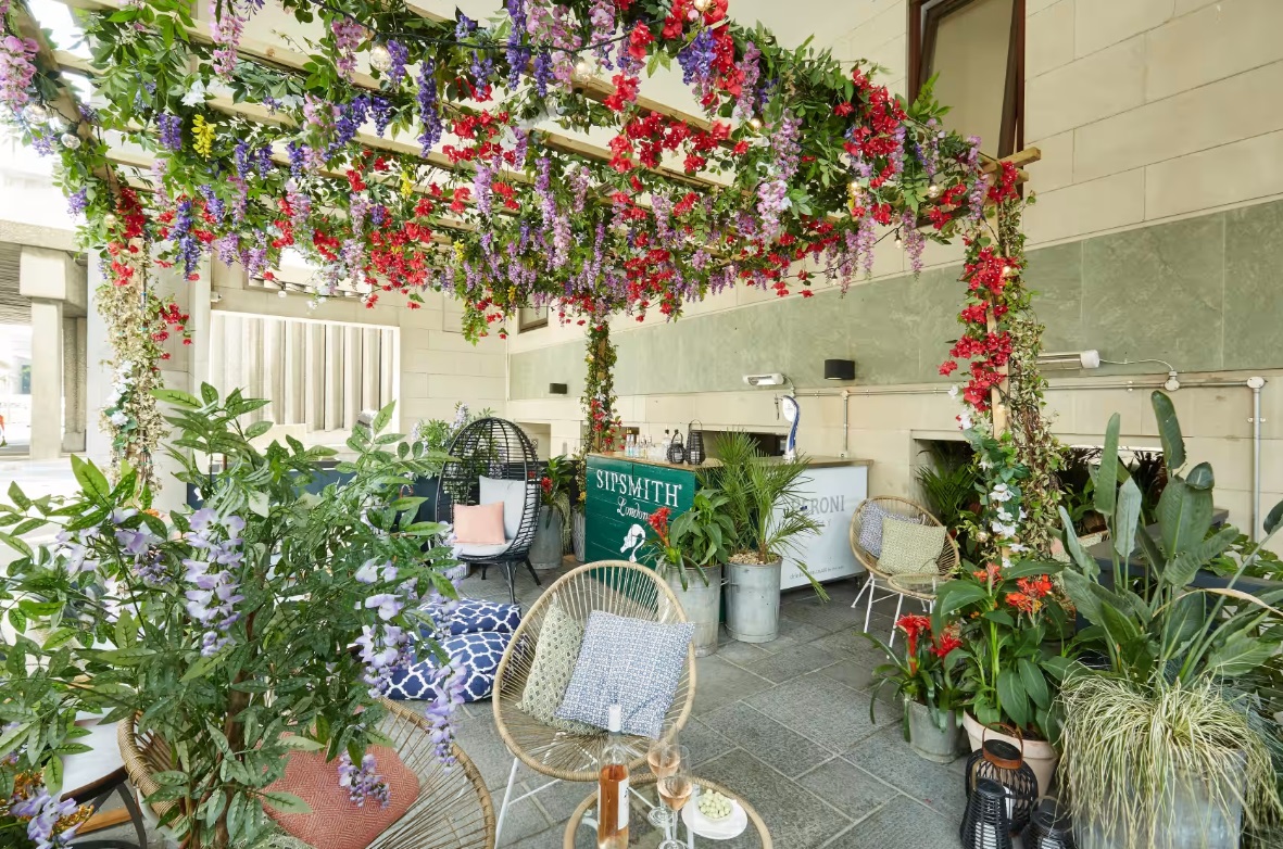 Experience the enchantment of a summer terrace nestled behind the Royal Festival Hall, offering a delightful outdoor dining and drinks experience.