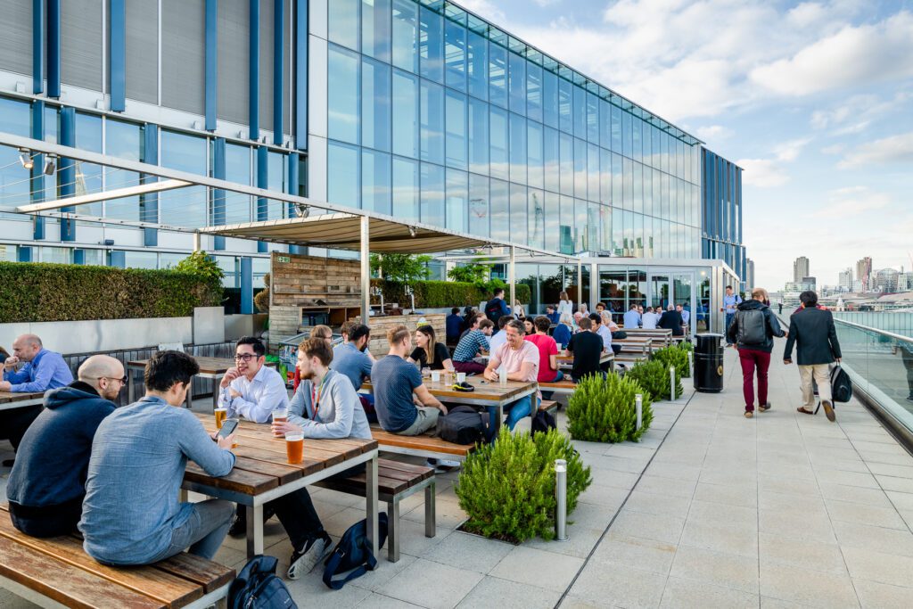 The Wintergarden stands as Blue Fin’s striking double-storey, minimalist glass reception area. With a capacity of up to 300 standing guests or 140 for a sit-down dinner, it promises an exceptional experience suitable for shared parties, intimate gatherings, or summer parties. Guests can enjoy a rooftop BBQ overlooking the city skyline before transitioning indoors for an after-party complete with a DJ and dance floor. Meanwhile, the East Terrace provides a charming spot to soak in the sunshine, offering panoramic views of London’s skyline and the shimmering sunset over the Thames.