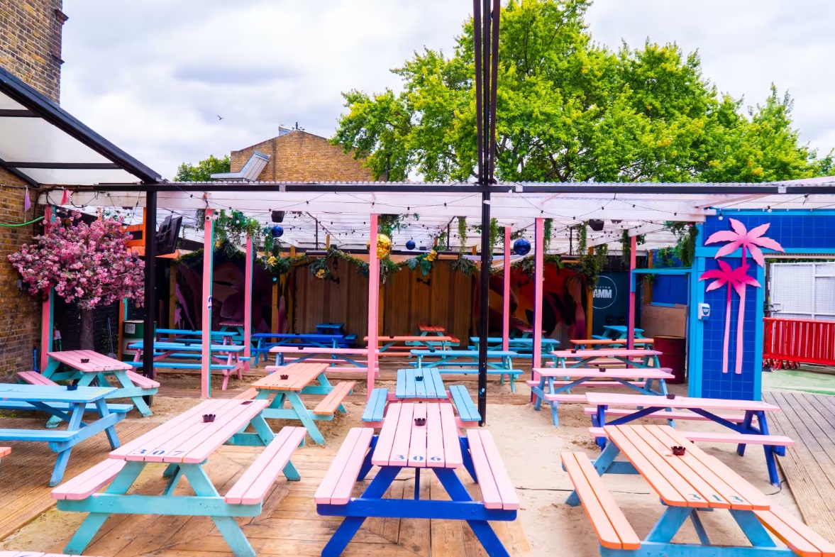 Equipped with a fully retractable roof, an outdoor bar, heated booths and benches, and two tons of golden sand beneath, the beloved Beach presents a serene getaway from the urban sprawl of London, no matter the weather.