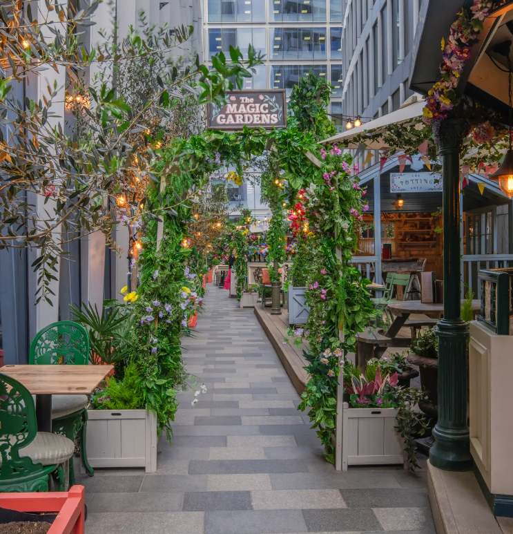 The Magic Gardens provides a partially covered space with efficient heating systems, ensuring a comfortable experience regardless of the weather conditions. Accommodating up to 110 people, it’s an ideal spot to gather friends, colleagues, or clients for an exceptional outing.