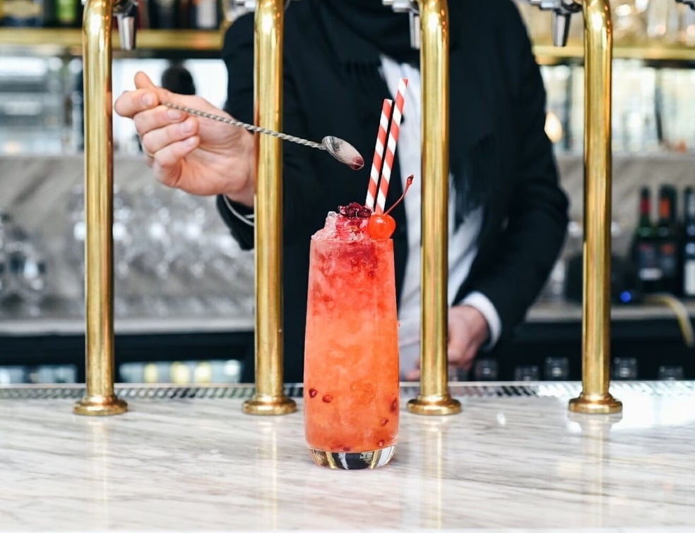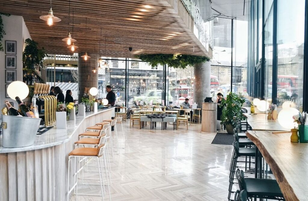 Featuring glass frontage on three sides and towering double-height ceilings, Timmy Green showcases a greenhouse-inspired design, accented with touches of gold and wood to evoke a natural feel. The venue is ideal for summer parties, offering extensive terrace space, as well as accommodating large festive bookings.