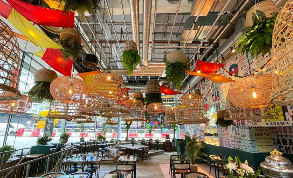 The restaurant boasts an atmosphere that’s grand and spirited, where colossal wicker lanterns dangle from the ceiling, accentuated by vibrant kites gracefully drifting amidst them, adding a touch of drama and festivity to the space.