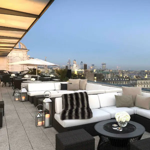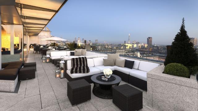 Arriving guests pass through the Marconi lounge and ascend to a dedicated hotel lobby and champagne bar on the first floor, housed within a dramatic nine-storey high pyramid, clad entirely in white marble. On the top floor, the hotel’s roof top bar offers indoor and outdoor space which can only be described as an urban oasis with spectacular views of the London skyline and River Thames.